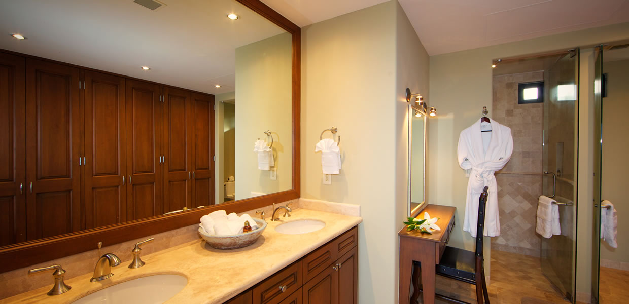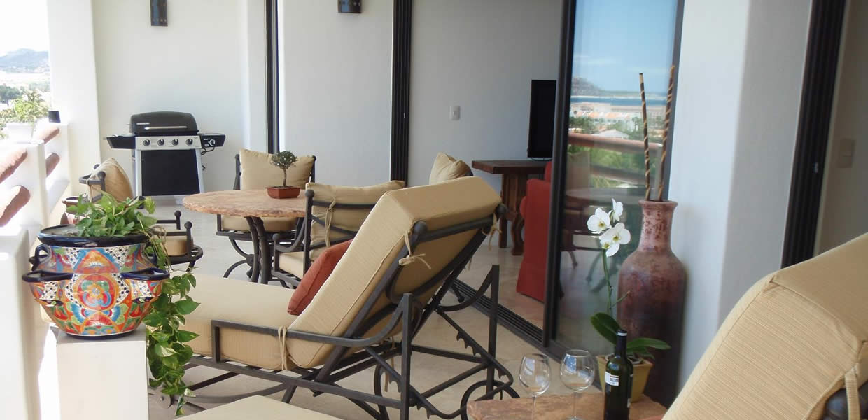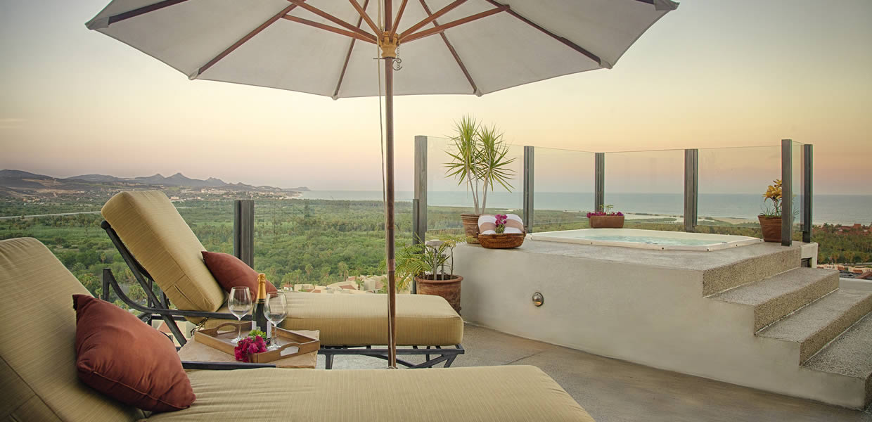 The extra roof top terrace on top (1,050 sq.ft.) features a comfortable lounge area, a Gas BBQ grill, outside shower and Jacuzzi and provides panoramic views to the Sea of Cortez, the best fairways and golf course in Cabo, the estuary, Puerto Los Cabos marina and the magnificent Baja desert.